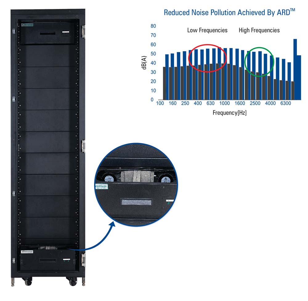 The AcoustiRACK™ ACTIVE (ARA™) is a soundproof, cabinet providing unprecedented levels of noise reduction up to 30 dB(A) with 8 KW of heat dissipation and dust protection for 19-inch servers and networking equipment. When combined with unique, high-quality acoustic materials, the ARA™ achieves previously unattainable spatial noise reduction over the entire frequency bandwidth of the audible spectrum